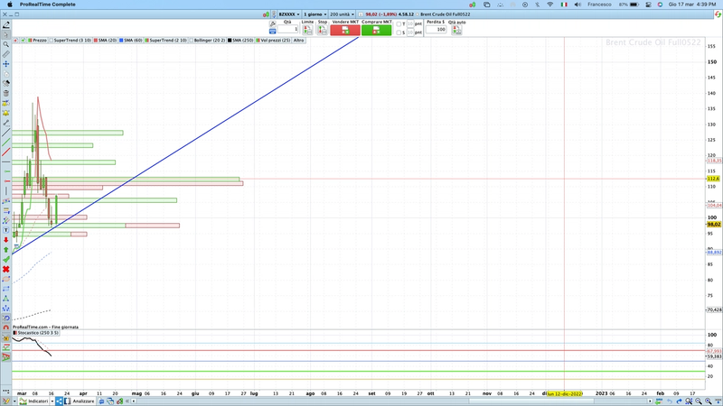 Petrolio sulle "montagne russe", un giorno vola sui massimi a 130 dollari il barile e in poche sedute si riporta sotto i 100 . La pazzia della guerra si riflette anche sulle quotazioni. Ci aspettiamo un calo della volatilità e un riconoscimento delle trendline.