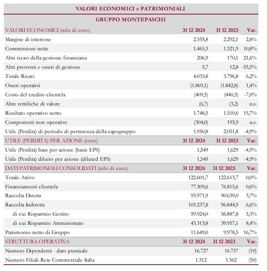 - utile di esercizio di pertinenza della Capogruppo a 1,951 miliardi: si compara a un utile di 2,052 miliardi del 2023 (che aveva beneficiato dei rilasci netti nella voce degli accantonamenti ai fondi per rischi e oneri).