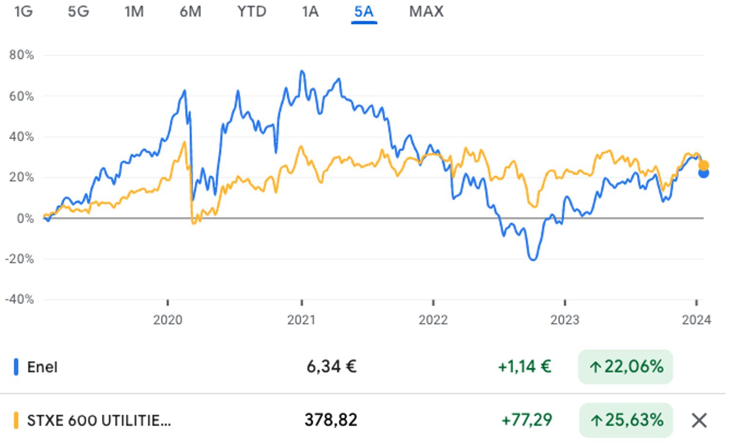 Nel grafico qui sotto un confronto fra l’andamento di Enel e dell’indice Stoxx 600 Utilities negli ultimi cinque anni.