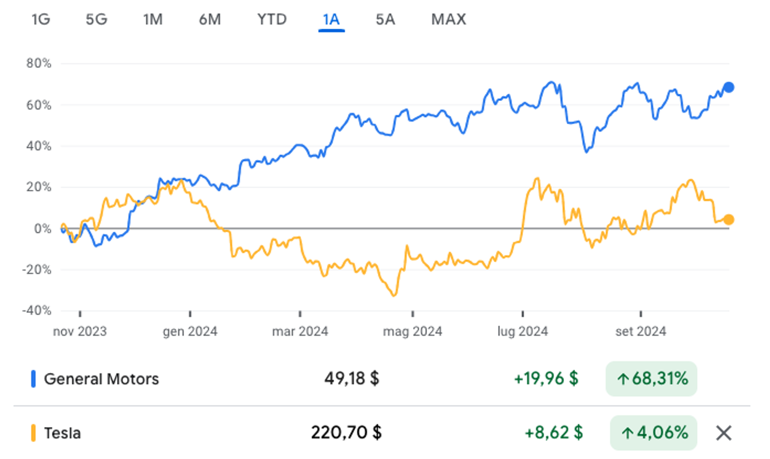 Nelle prossime 48 ore i due colossi Usa dell’automotive comunicheranno i dati del terzo trimestre. GM ha alle spalle un rialzo del 36% dall’inizio dell’anno grazie al miglioramento del margine operativo. Tesla sta lottando per bloccare la discesa del suo margine.