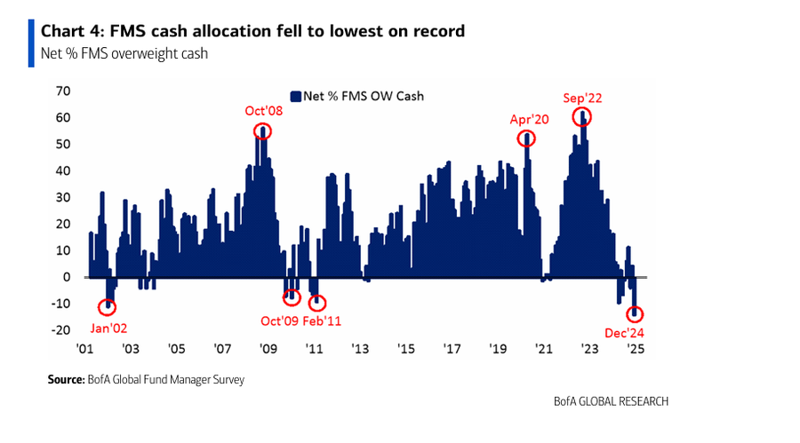 In termini di liquiditร , lโallocazione di cash รจ diminuita al 3,9%, il livello piรน basso registrato da anni, segnalando una decisa esposizione al rischio.