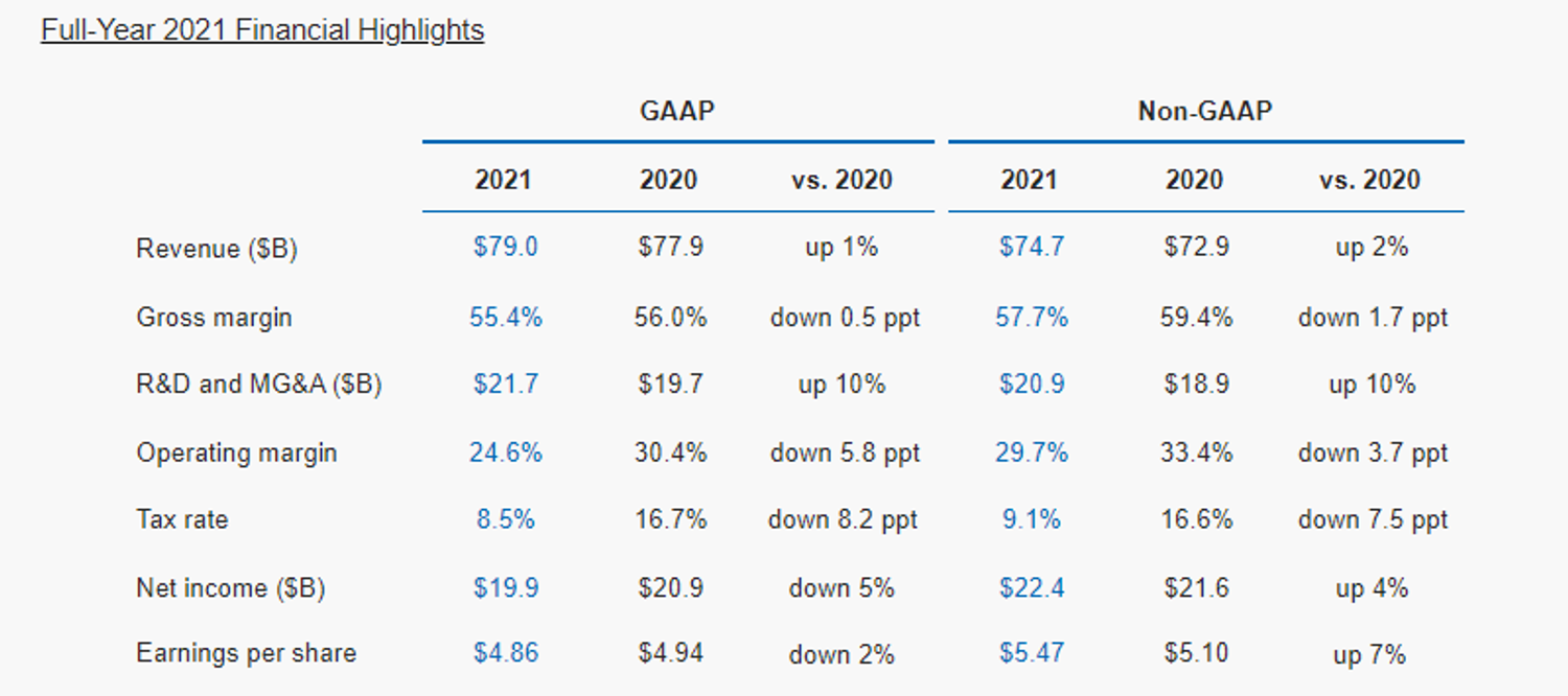 Nel trimestre terminato il 25 dicembre le entrate GAAP sono aumentate su base annuale fino a 20,5 miliardi di dollari, in crescita del 3%, mentre quelle non GAAP sono risultate di 19,5 miliardi rispetto ai precedenti 18,9 miliardi (+4%). Le previsioni degli analisti si fermavano a 18,4 miliardi di dollari.