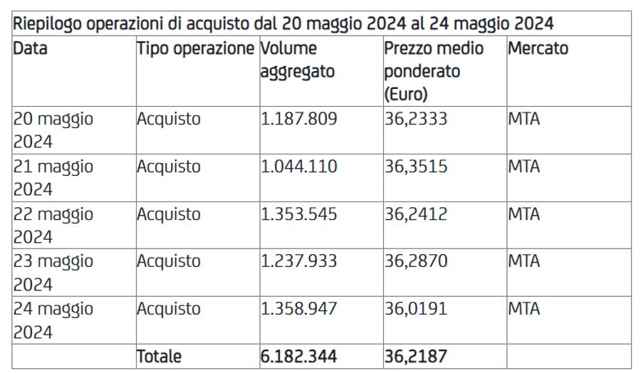 Tra il 9 e il 17 maggio 2024 la banca milanese aveva già acquistato un totale di 7.424.440 azioni, pari allo 0,44% del capitale sociale, per un controvalore complessivo di quasi 270 milioni di euro, a cui si sono aggiunte 6.182.344 azioni proprie al prezzo medio ponderato di 36,2187 euro, per un controvalore di circa 224 milioni di euro acquistate tra il 20 e il 24 maggio annunciate questa mattina e corrispondenti allo 0,81% del capitale.