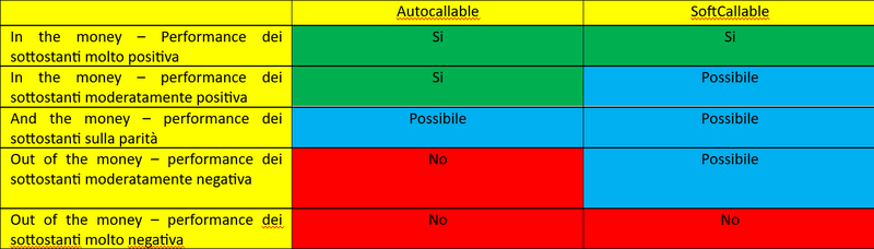 Nella seguente tabella il confronto dei possibili rimborsi con certificate Autocallable e Softcallable: