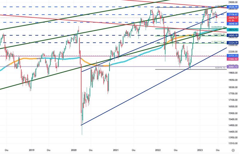 L’indice, dopo aver formato un doppio massimo di breve periodo, perde area 28.000 e testa prezzi più bassi. Solo il mantenimento o il superamento di alcuni livelli chiave potranno indicare una direzione più precisa.