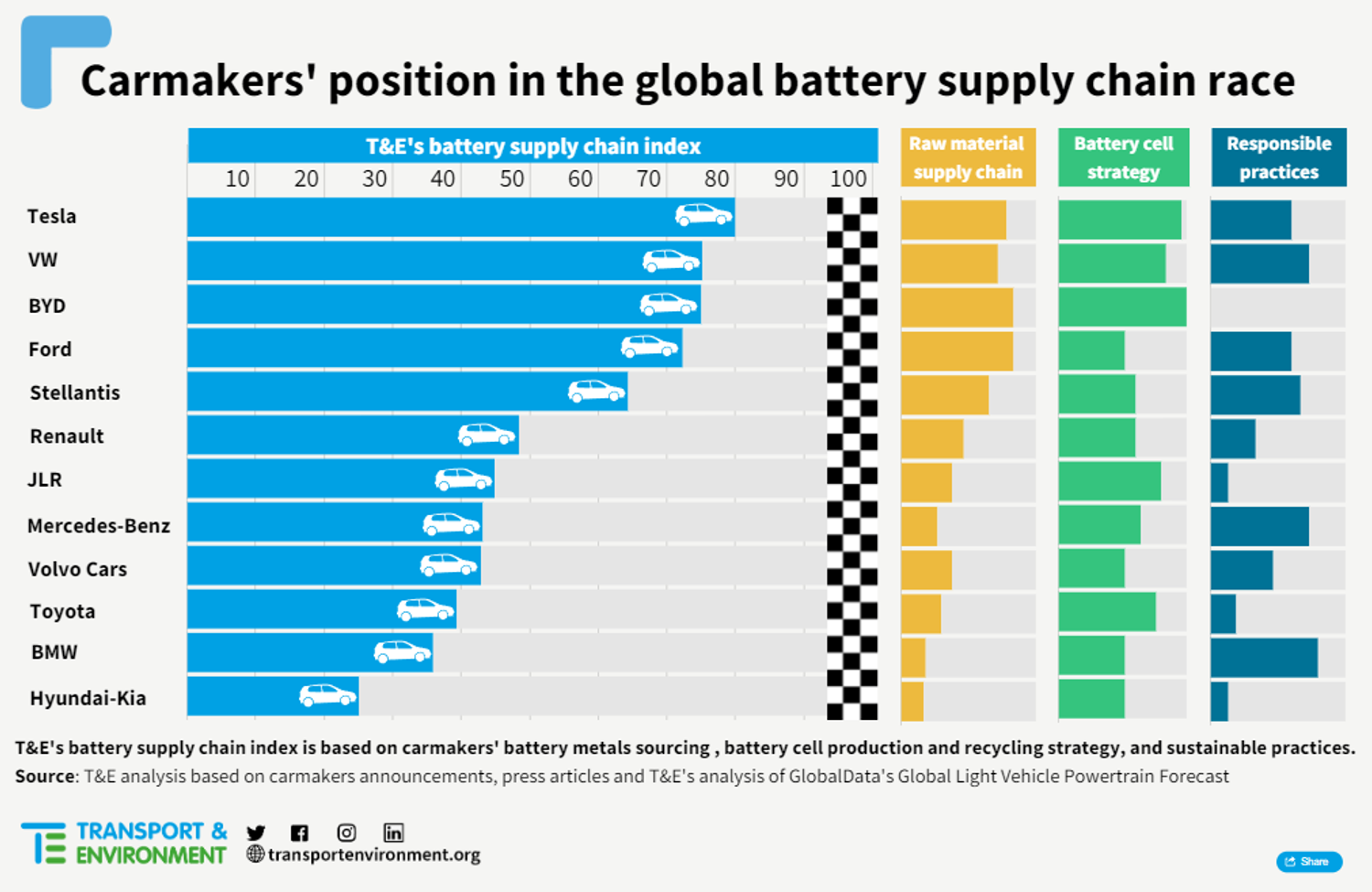 Secondo il rapporto di T&E, il livello di preparazione tra i costruttori di auto varia ampiamente: mentre Tesla guida la classifica generale (e BYD è in cima alla parte relativa all'approvvigionamento di minerali), Volkswagen (VW) è l'unico costruttore di auto tradizionale a ottenere più di 70 punti su 100, mentre Ford e Stellantis sono relativamente ben preparate, con punteggi superiori a 60 ciascuno.