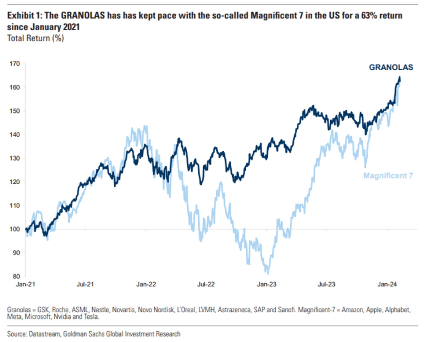 Goldman Sachs si è inventata i GRANOLAS, 11 società europee che dal 2021 a oggi hanno performato altrettanto bene delle Magnificent Seven e oggi sono più interessanti delle Big Tech americane perché meno care e meno rischiose.