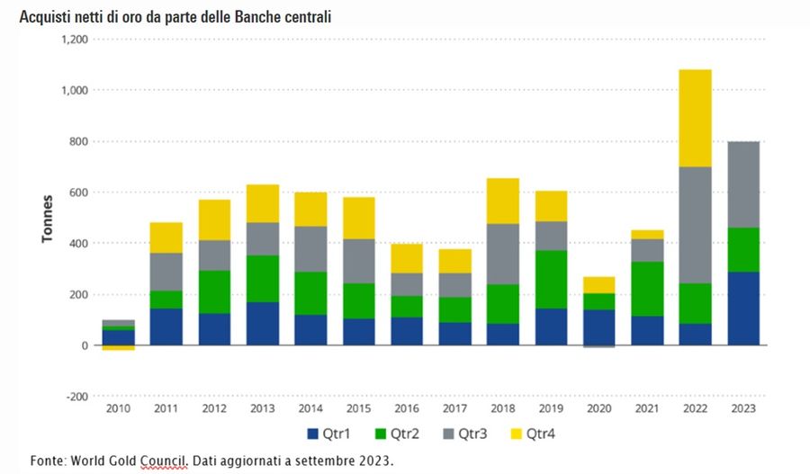 Le banche centrali hanno effettuato ingenti acquisti d’oro nel 2023, che alcune stime indicano come superiori a quelli dello scorso anno, già importanti.