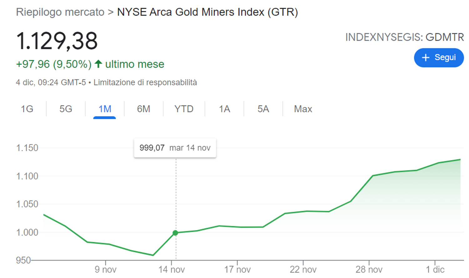 L’indice ha registrato un incremento del 4,2% ad ottobre, per poi aumentare dell’11% a novembre, risultato migliore rispetto a quello dell’oro (+3,8%), rafforzandosi soprattutto nella seconda parte del mese.