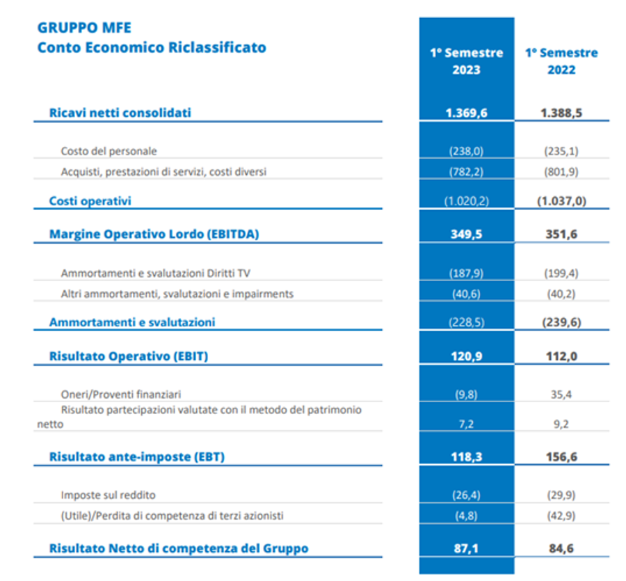 Nel dettaglio, il primo semestre della ex Mediaset ha visto i ricavi netti calare leggermente, passando dai 1.388,5 milioni del periodo precedente ai 1.369,6 milioni.