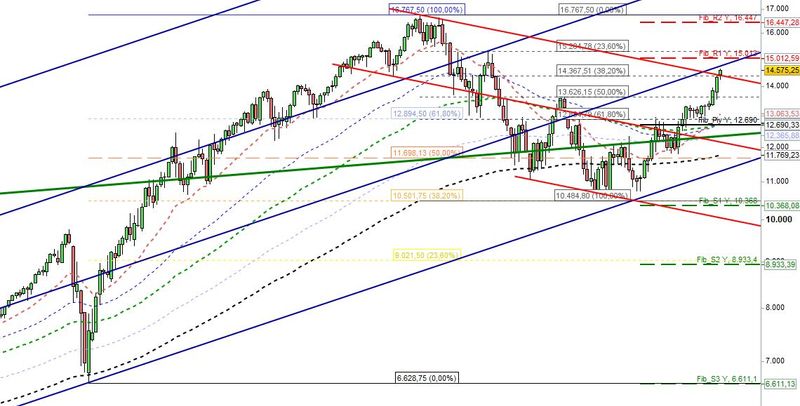 La tendenza di fondo del Futures e-mini Nasdaq è sempre rialzista sia di fondo che sul brevissimo termine. Il movimento che ha portato e-mini a toccare il 38,2% di Fibonacci a quota 14.367,75 USD pare non essersi esaurito completamente. Il mantenimento di 14.462,75 USD mantiene il corso rialzista con target 14.627,00 USD con estensione a 14.720 USD.
