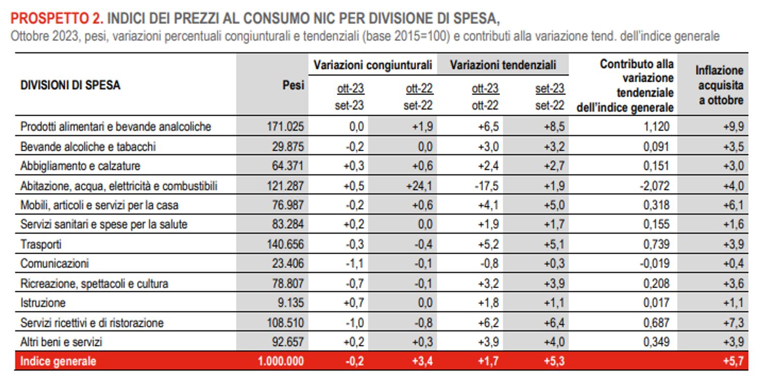 L’inflazione acquisita per il 2023 risulta pari a +5,7% per l’indice generale e a +5,1% per la componente di fondo.