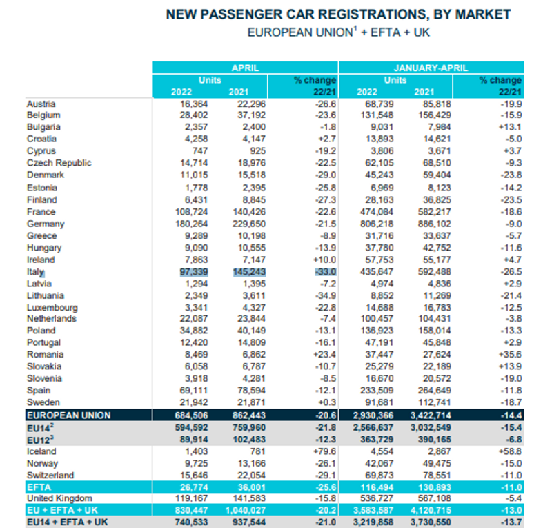 Continuano a pesare i problemi della catena di approvvigionamento sul settore auto europeo e il calo delle immatricolazioni di aprile si conferma complessivamente a due cifre.
